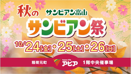 「2025秋のサンビアン祭」開催のご案内 直営店【サンビアン富山アピア店】「2025秋のサンビアン祭」開催のお知らせです!2025年10月24日[金] 25日[土] 26日[日] 3日間開催楽しい企画を盛り沢山、ご納得価格でご提供 !皆様のお越しをお待ちしております。